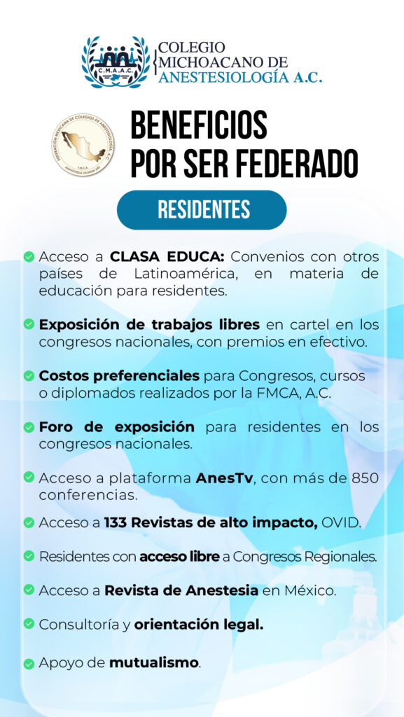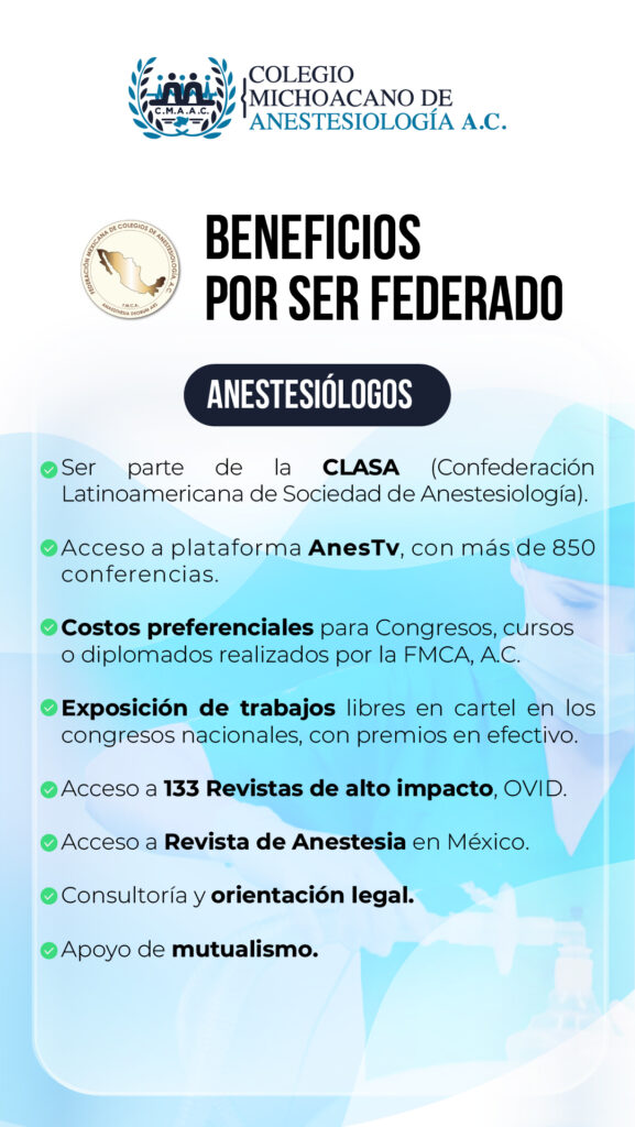 Ser parte del Colegio Michoacano de Anestesiología A.C. y estar federado ante la FMCA brinda a anestesiólogos y residentes acceso a educación continua, plataformas académicas, revistas científicas, costos preferenciales en congresos y respaldo profesional, legal y mutualista, fortaleciendo su desarrollo y actualización constante.